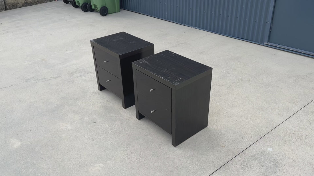 Set of two compact black bedside tables featuring two drawers each for convenient storage. Simple, modern design that works well in bedrooms, guest rooms, or as small side tables. Solid and sturdy overall, with visible surface wear on the tops from normal use, as shown.