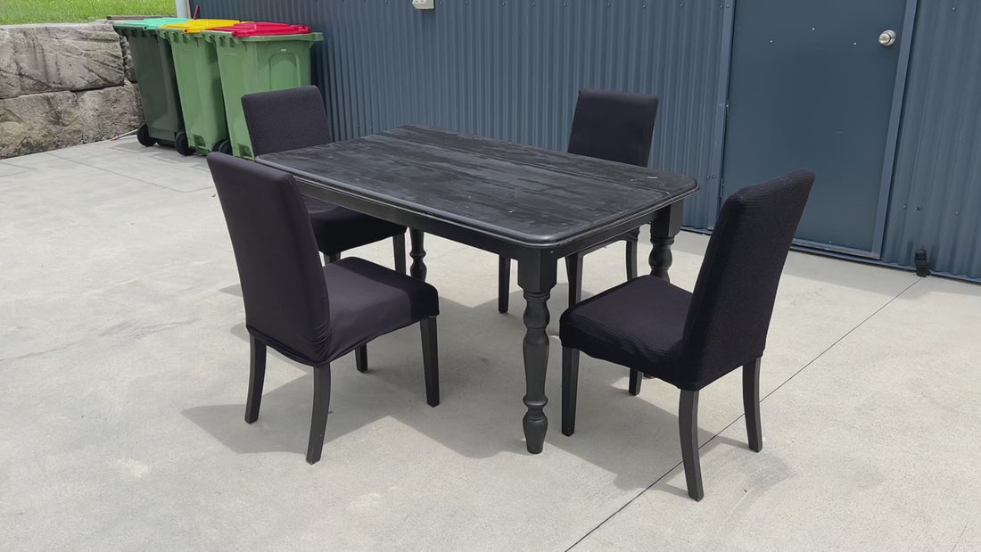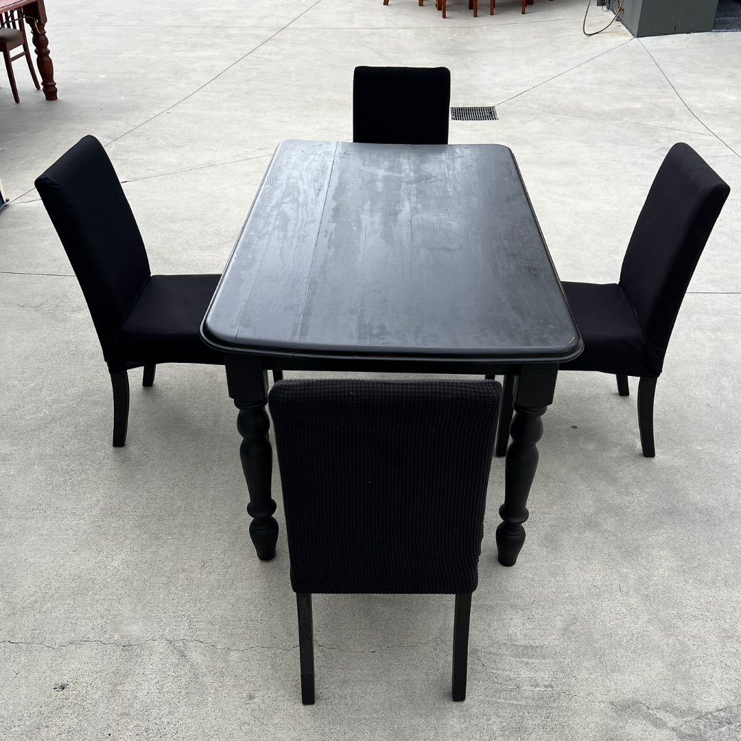 Modern black dining set featuring a solid wood table and four matching chairs. Sturdy construction with a clean, minimalist look that suits both modern and classic spaces. The tabletop shows visible wear and tear from normal use, as shown in the video below, but the table remains solid and fully functional.