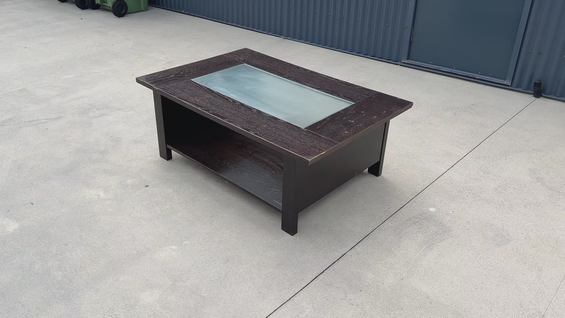 Stylish coffee table featuring a dark timber frame with a frosted glass centre panel. Solid and sturdy build with a clean, modern look, plus a lower shelf for extra storage or display. Ideal for living rooms, lounges, or entertainment areas.