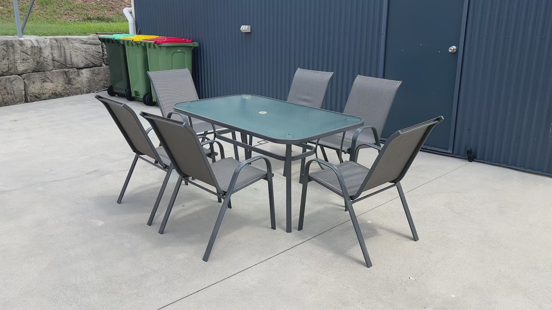 Stylish outdoor dining set featuring a glass-top table and six matching chairs. Lightweight yet sturdy design, ideal for patios, decks, or alfresco areas. Comfortable seating and a clean, modern look that suits most outdoor spaces. Good condition with minor wear from normal outdoor use.
