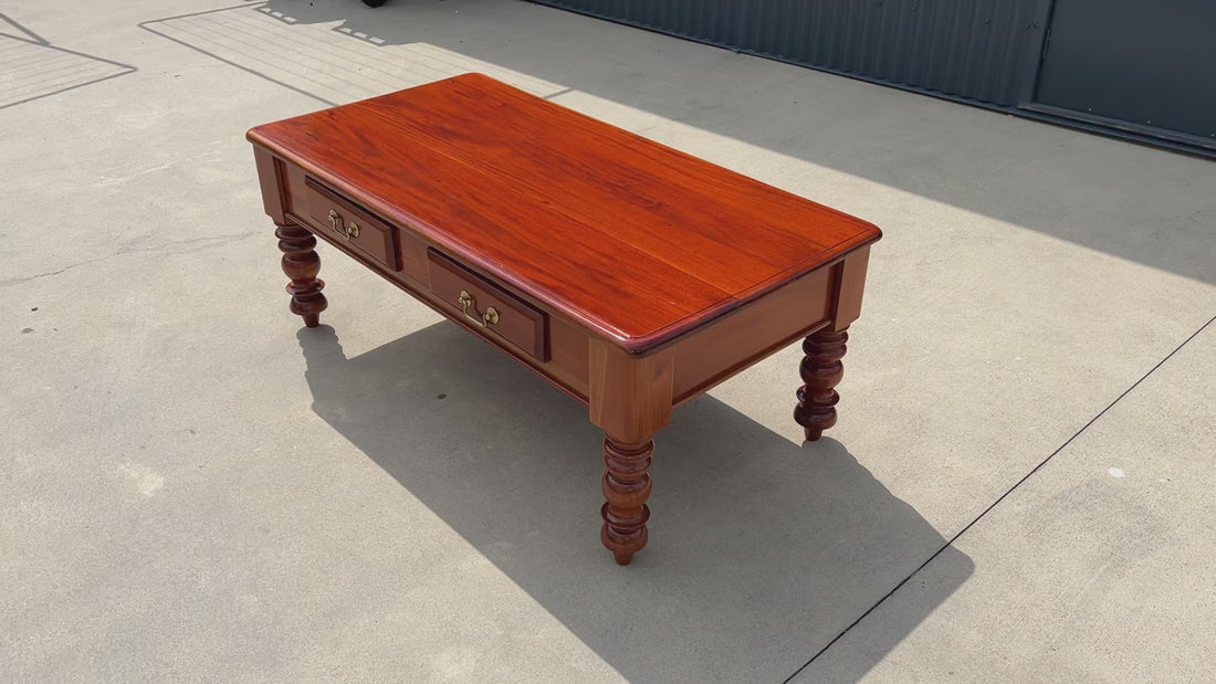 Classic solid wood coffee table featuring a rich timber finish, turned legs, and two built-in drawers for convenient storage. Sturdy and well-built with a timeless design that suits both traditional and modern living spaces.